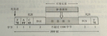 在这里插入图片描述  PPP帧的首部和尾部分别为4个字段和2个字段,信息字段的长度是可变的,但不能超过1500字节。  PPP首部的第一个字段和尾部的第二个字段(最后一个)都是标志字段F(Flag),规定都是0x7E,符号0x用来表示它后面的字符都是十六进制表示的,7E则是(01111110),标志着一个字段的开始或结束。(其实就是上文提到的定界符)  首部的第二个字段A规定为0xFF,首部的第三个字段C规定为0x03(00000011).这两个字段的值的意义至今没有被给出。  首部的第四个字段则是协议字段,占据两个字节。  如果是0x0021,表示信息字段是IP数据报。  如果是0xC021,说明是PPP链路控制协议LCP的数据。  如果是0x9021,说明是网络层的控制信息。   尾部的第一个字段(2个字节)是使用CRC的帧校验序列FCS